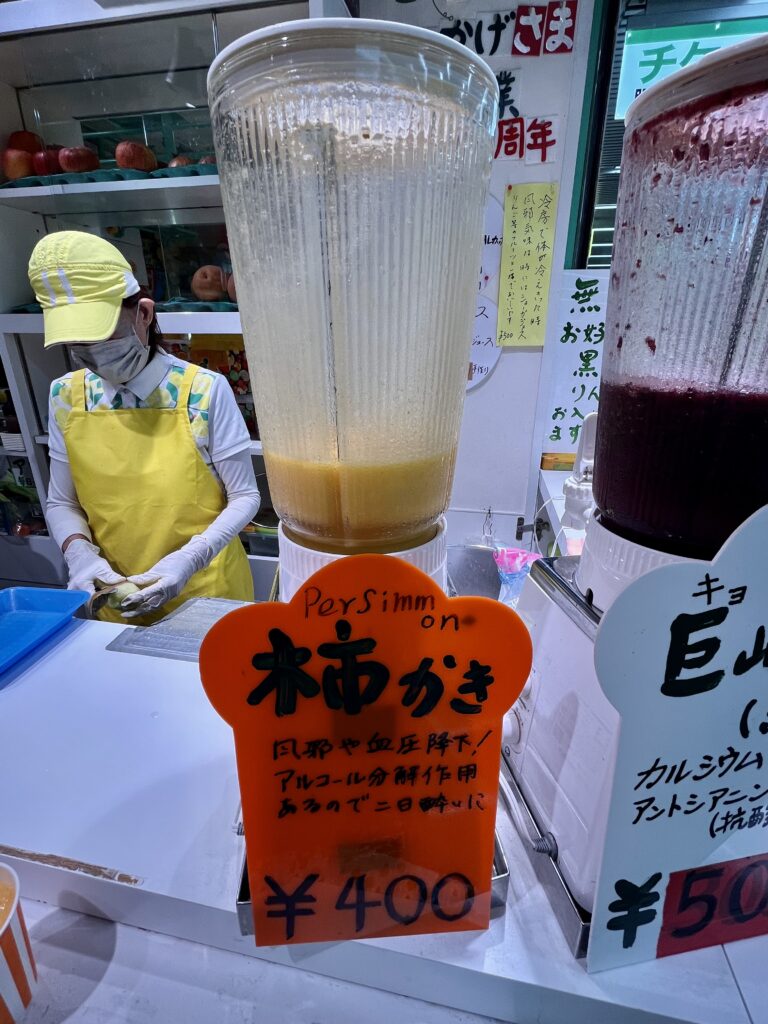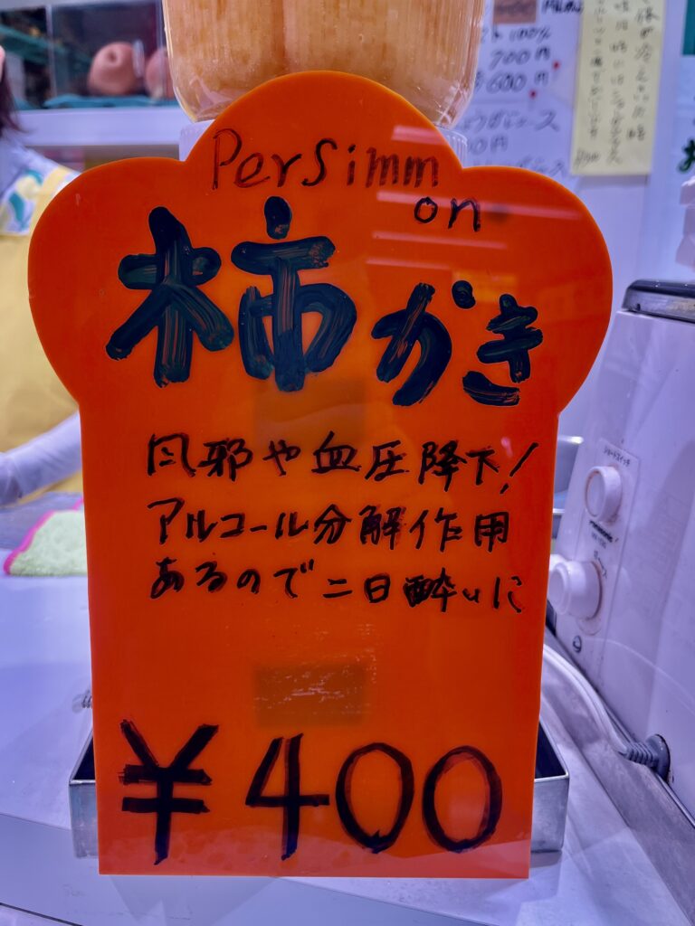 写真を撮っていいかお聞きして、柿ジュースのジューサーを撮りました。お店を切り盛りしているのは、店長の81歳の女性の方(テレビ情報)ですが、年齢を感じさせないテキパキとした働きぶりに感心。高齢になっても働くって、憧れます。一緒に写ってしまいましたが、マスクと帽子で顔が見えないから、掲載です。