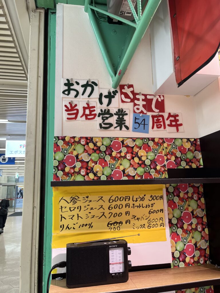 「おかげさまで当店営業54周年」の看板がありました。ビルの完成と同時に開業したお店です。ちゃんと「○周年」のところが可変式になっているのが律儀です。ダイヤル式ラジオからラジオ放送が流れているのも、昭和感満載でGood!