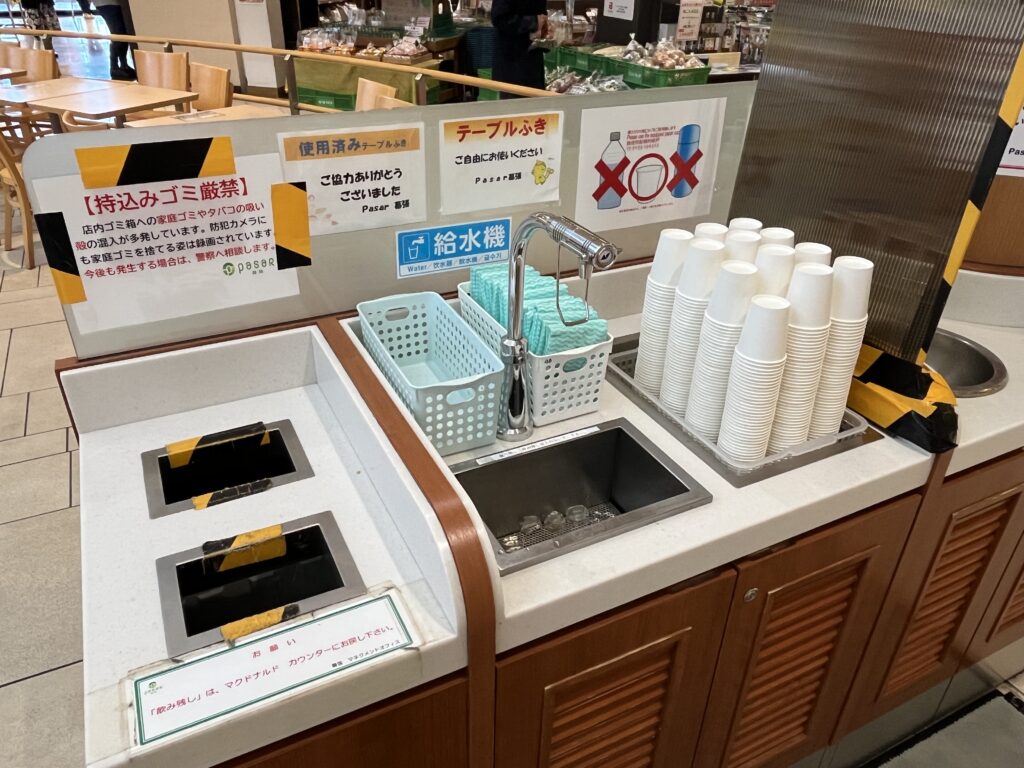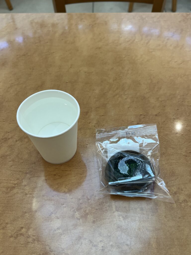 まんじゅうといえば緑茶かな、と思い周囲を見渡しても、無料のお茶の給湯器はありませんでした。サービスエリアにはたいていあるイメージですが。こちらも仕方がないので、お水で代替です。