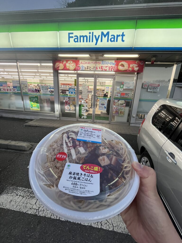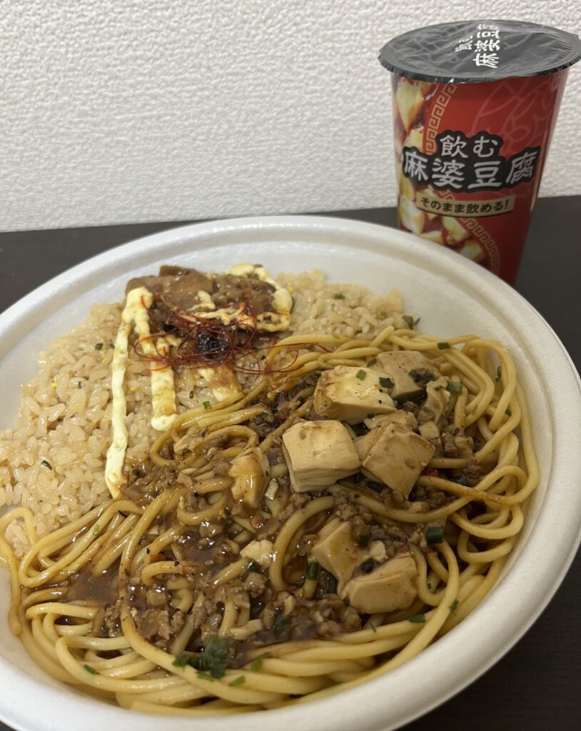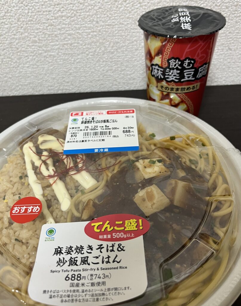 『飲む麻婆豆腐』を探し回っていたら夕飯の時間になり、お腹も空いたので、コンビニ3大チェーンの一角、ファミリーマートで、同じく13日に新発売された『てんこ盛!麻婆焼きそば&炒飯風ごはん』を買いました。