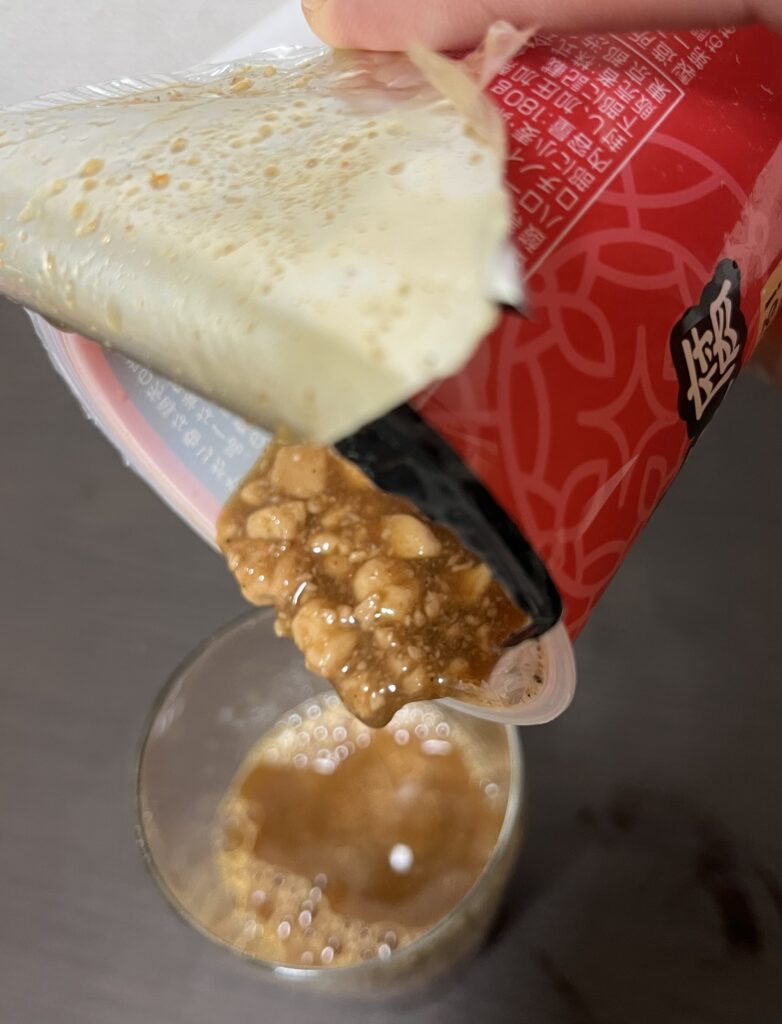 コップにあけてみると、お豆腐やひき肉がたくさん入っていました。だから、太いストローになっていたんですね。