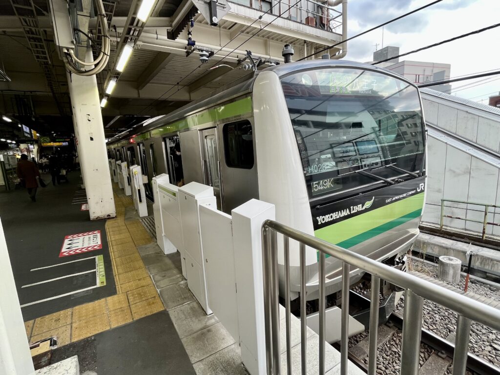 東神奈川駅で出発を待つ、八王子行きの電車です。