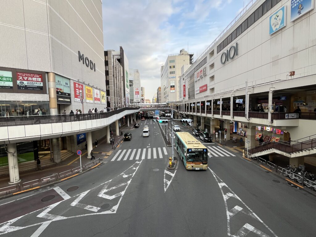 JR町田駅と小田急線の町田駅はペデストリアンデッキで結ばれ、周囲には商業施設が林立し、多くの人が行き交います。